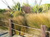 Oi Oi is a reed with fine grey-green leaves with brownish bracts at the joints, forming a large densely erect clump. It produces flowers from late spring to summer adding interest and softening the plant.
