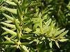 Flowers/Fruit: Inconspicuous reproductive structures; produces small red fleshy fruit (arils) that attract birds.