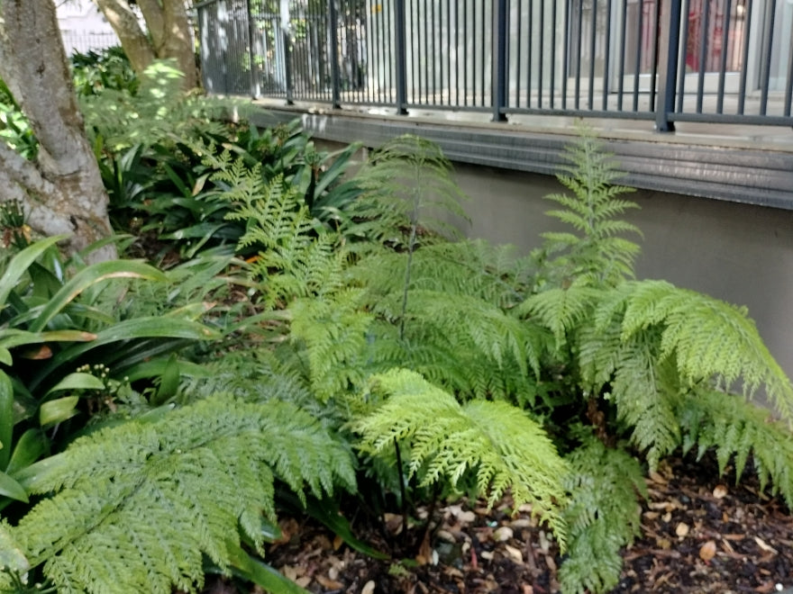 A hardy native fern that thrives in filtered light and sheltered shade. It brings softness and woodland character beneath trees or along shaded paths.