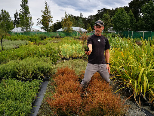 Coprosma ‘Red Rock’ — compact divaricating shrub that tolerates wind and sun, suited for small gardens or understorey planting in exposed positions.